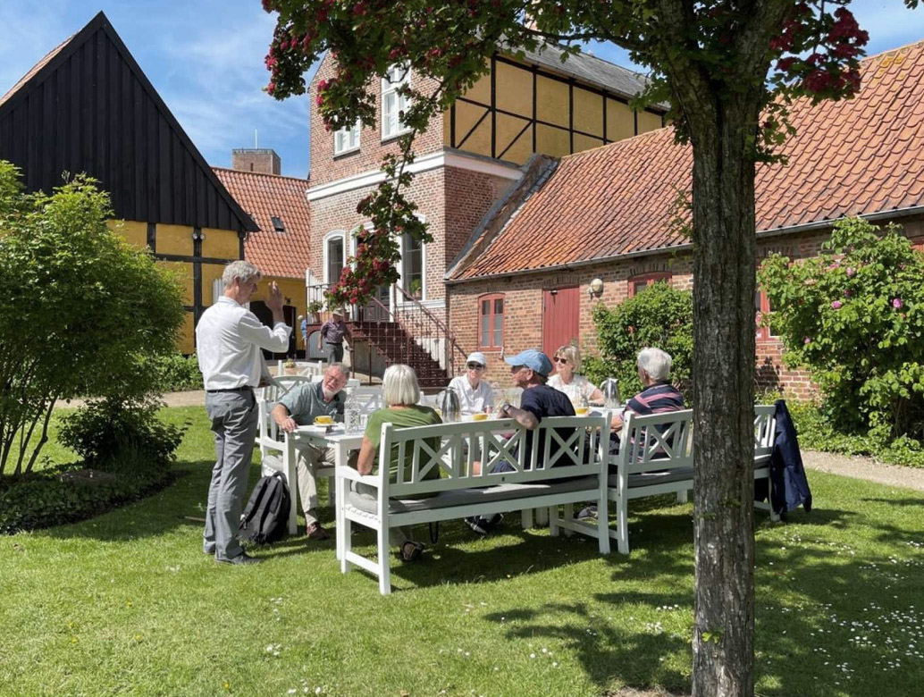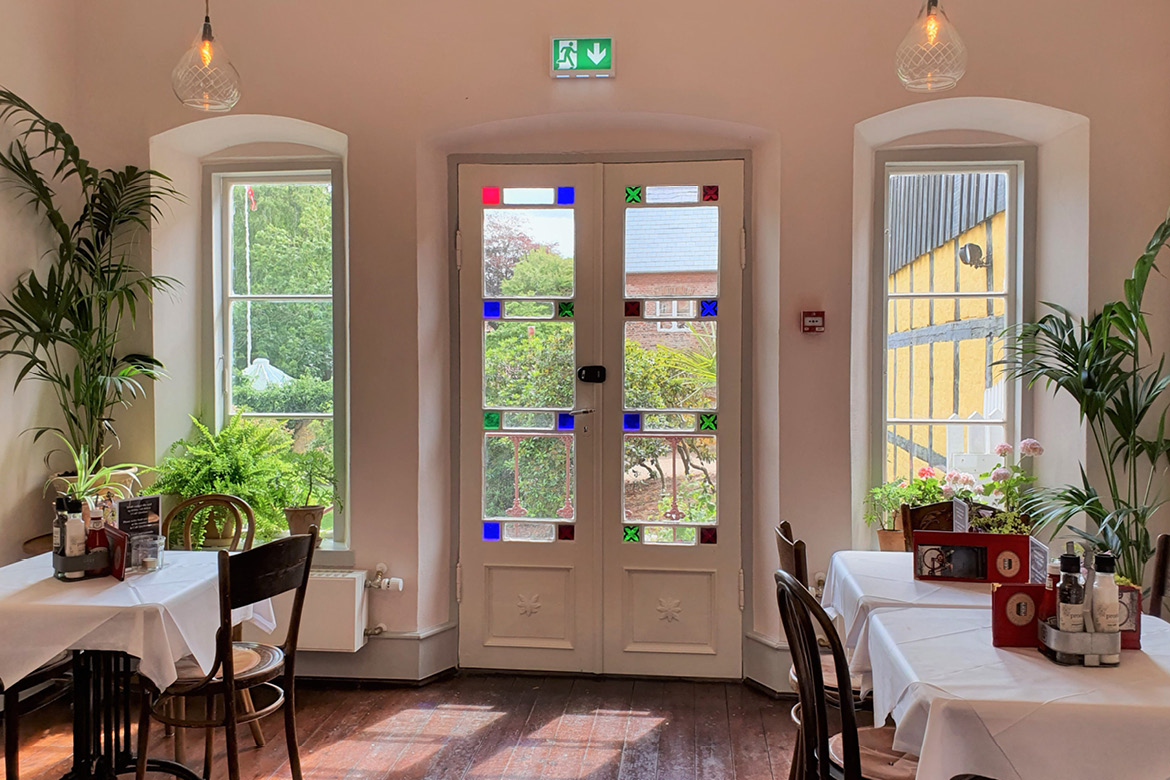 Das schöne Gartenzimmer, in dem Sie zum Beispiel eine Tasse Kaffee genießen können, blickt auf den Innenhof und den Rosengarten. Es wurde 1854 eingerichtet und ist eine Erweiterung des Seitengebäudes, das aus dem Jahr 1790 stammt.Das Gartenzimmer ist mit Gipsreliefs mit Motiven von Bertel Thorvaldsen dekoriert.Das gleiche Seitengebäude wurde 1865 um ein zweites Stockwerk erweitert, in dem sich auch die alte Küche aus dem 19. Jahrhundert, ein Wirtschaftsraum und ein Dienstmädchenzimmer befinden.