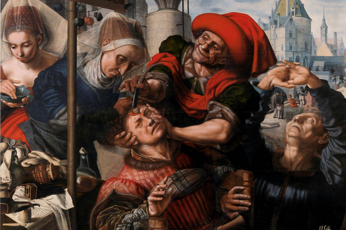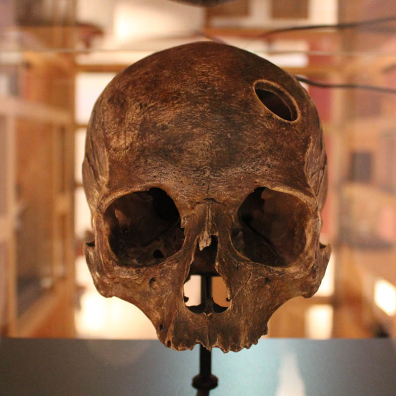 Illustration: Trepaneret kranie i HEX! Museum of Witch Hunt og ”Kirurgen”, maleri af Jan Sanders van Hemessen, ca. 1550-1555. Museo del Prado