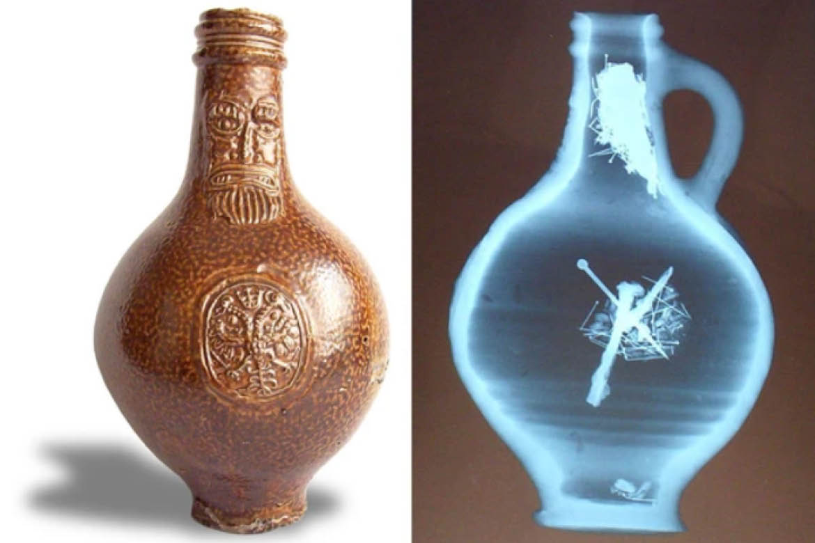 I 15- og 1600-tallet var heksefrygten på sit højeste, og derfor var heksen ”det onde”, man ville holde fra døren. I England brugte man ”hekseflasker”, tit en ”skæggemandsflaske”, som man fyldte med fx urin, hår, afklippede negle og bøjede søm. Så begravede man flasken i husets væg eller ildsted eller under gulvet. De personlige ejendele ville så tiltrække de onde kræfter, der blev spiddet af sømmene, og på den måde for evigt være fanget i flasken. I Danmark har vi ikke fundet hekseflasker magen til dem i England. Til gengæld har vi fundet beskyttende jydepotter de samme steder i folks huse som hekseflaskerne. Nogle af dem er tomme, og andre indeholder ondtafværgende sager som dyreknogler og hugorme. De er sikkert også placeret med intentionen om på magisk vis at holde ondskab ude.