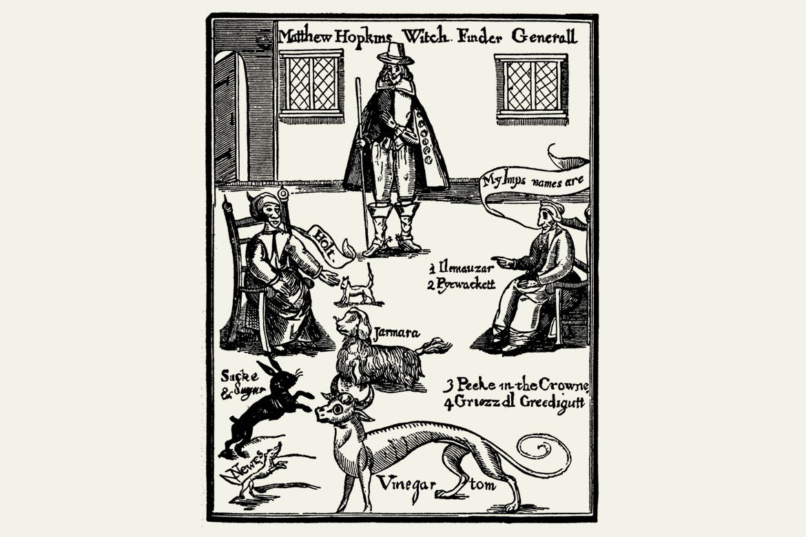 I 1647 udgav den selvudnævnte ”witch finder general” Matthew Hopkins en bog, The Discovery of Witches, hvori han beskrev sin heksejagt. På forsiden er han selv med to hekse og alle deres hjælpedjævle, som de kalder på ved navn