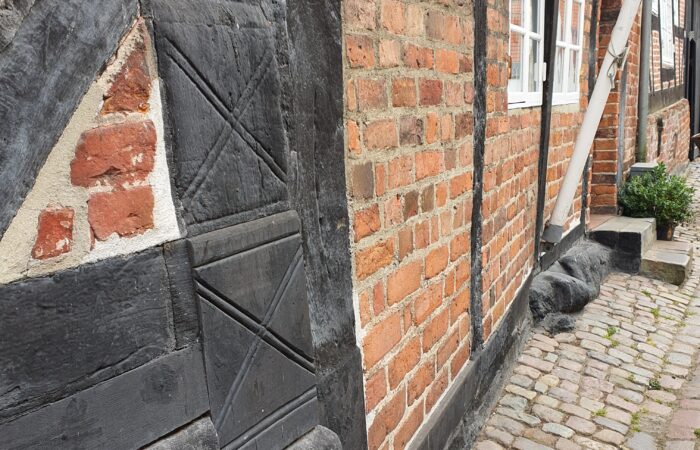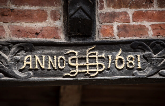 Kristusmonogrammet IHS mellem ”Anno” og ”1681” sidder over vores port i Sortebrødregade og beskytter os mod alt ondt.